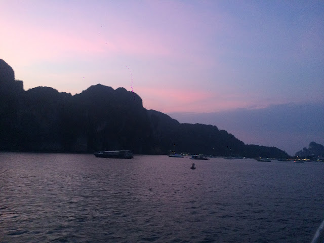 We managed to get here an hour or so before sunset, so set sail back to the main island of Koh Phi Phi whilst watching the sky change colour in front of us.